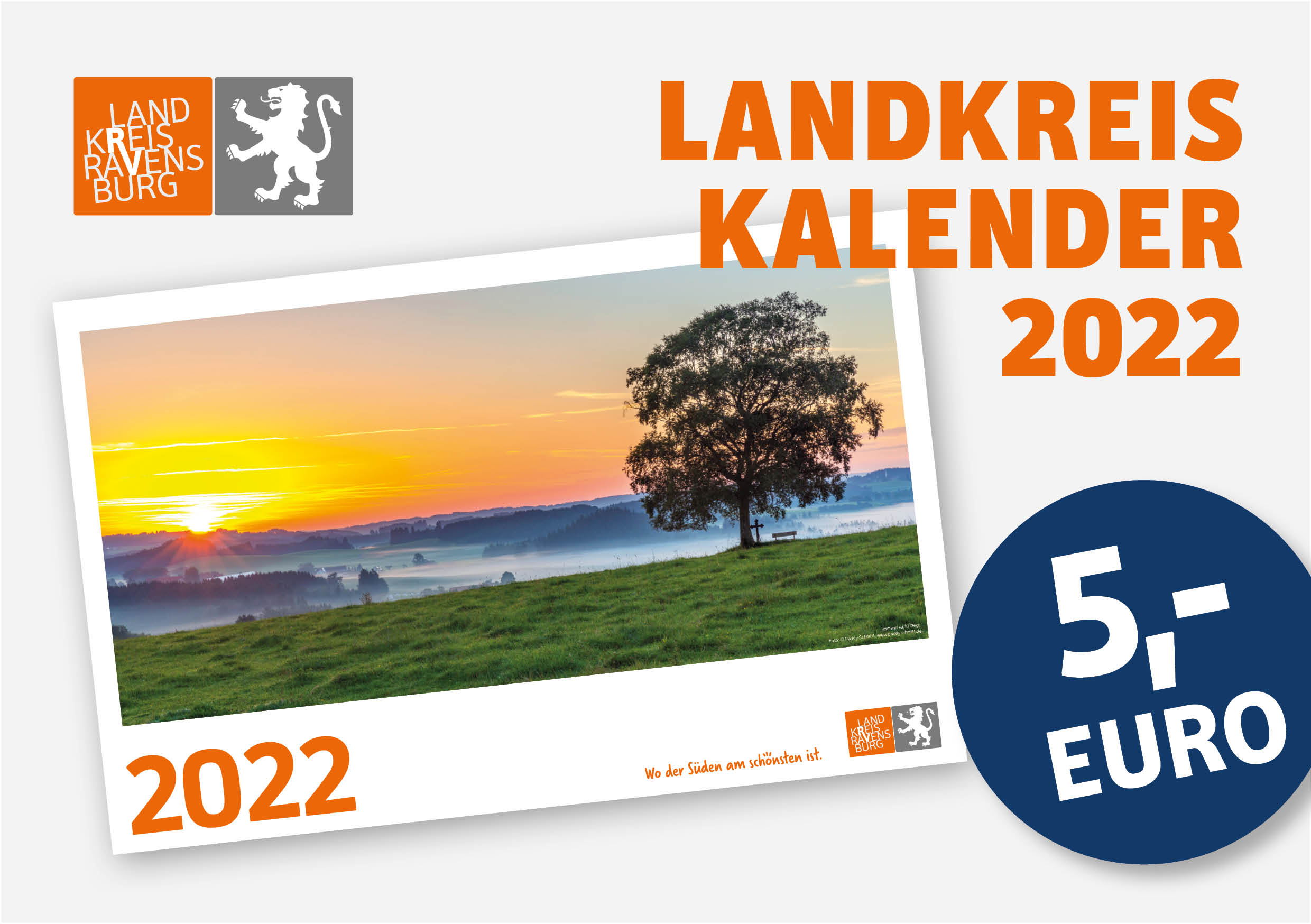 Kreis Ravensburg – Wo der Süden am schönsten ist – der Landkreiskalender 2022 des Landkreises Ravensburg mit den schönsten Aussichten aus unserer Region ist ab sofort für 5 € über die Filialen der Kreissparkasse Ravensburg sowie an den Standorten der Bürgerbüros des Landkreises in Bad Waldsee, Leutkirch im Allgäu, Ravensburg und Wangen im Allgäu erhältlich.